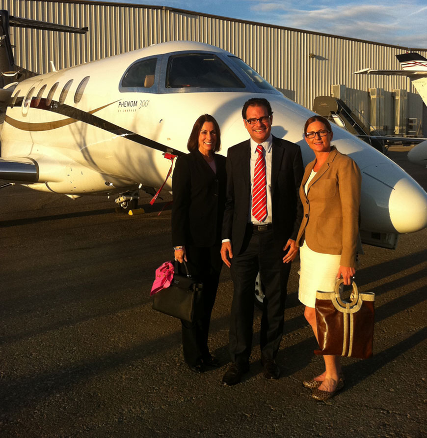 Las Vegas/NV October/2011 The NBAA Convention is all about seeing, touching and buying airplanes.   Janine Iannarelli and Heather Rubin of Par Avion Ltd. were pleased to present the Phenom 300 to Santiago Perez-Cirera Santacruz of Execujet S.A.  The Phenom was displayed at McCarron Airport as part of Par Avion’s promotional efforts during the show.